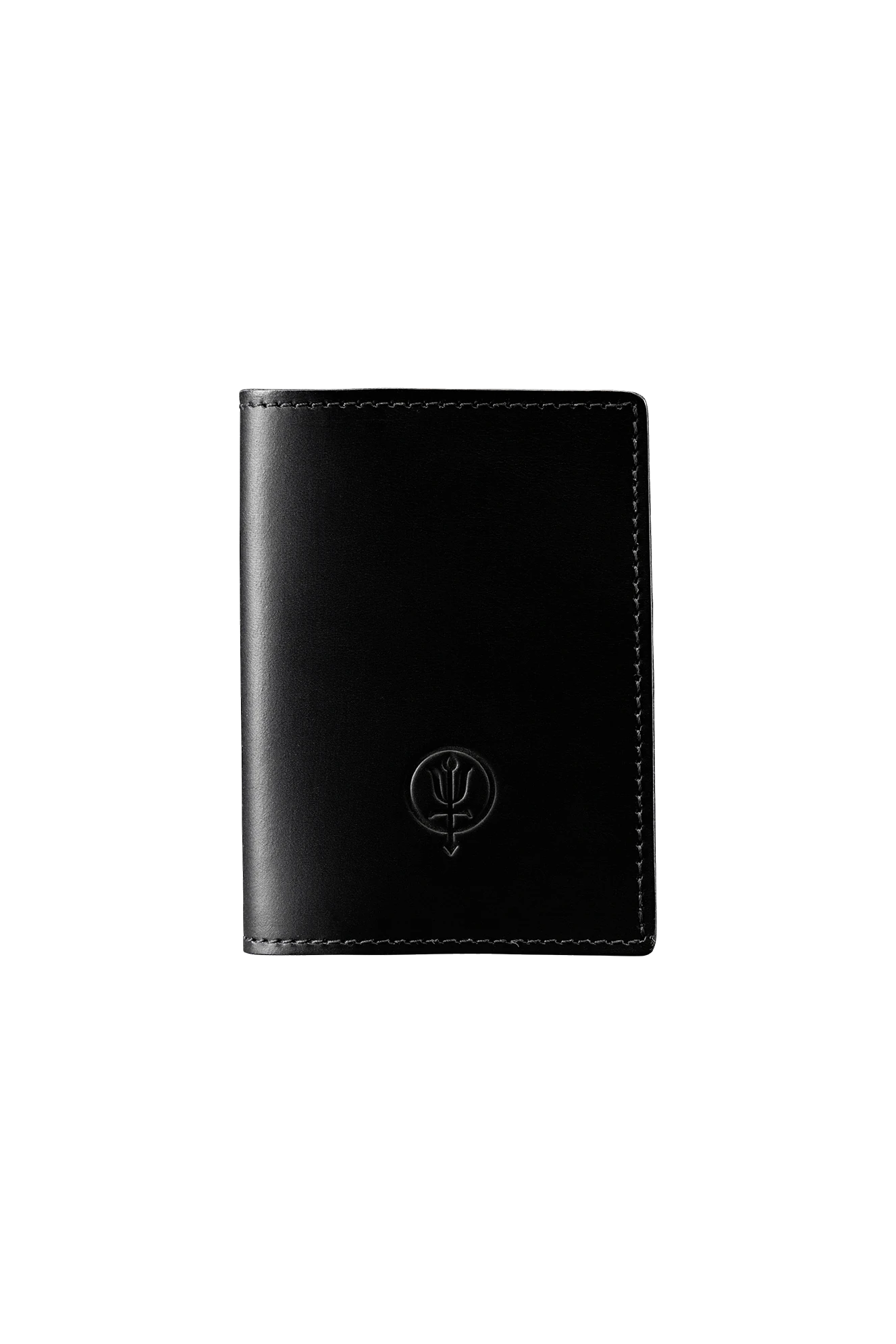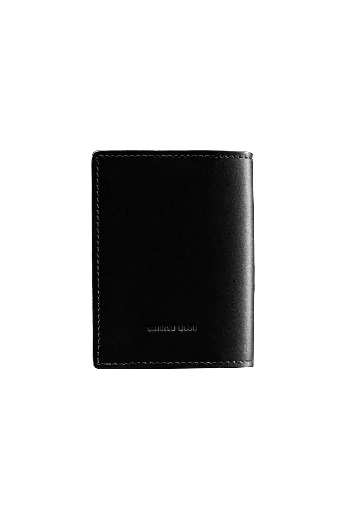British black leather bi-fold wallet cut, stitched, edged, and finished by hand with ThruDark Insignia.
